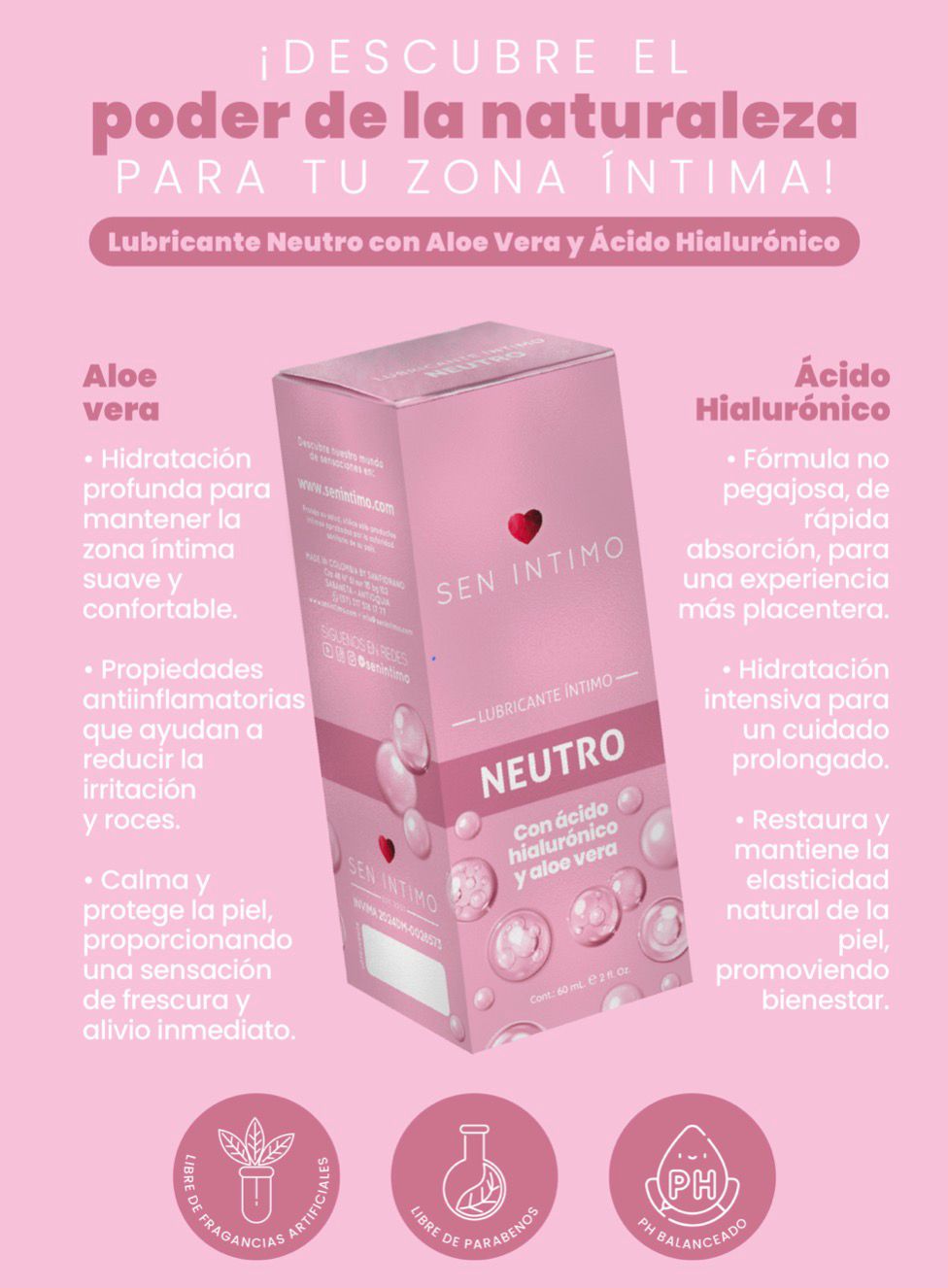 Descubre el equilibrio perfecto entre suavidad, hidratación y bienestar con nuestro Lubricante Íntimo Neutro, formulado especialmente para acompañar a la mujer en cualquier etapa de su vida. Su fórmula avanzada con Aloe Vera y Ácido Hialurónico brinda un cuidado único, ideal para quienes buscan comodidad y frescura durante sus momentos más íntimos.