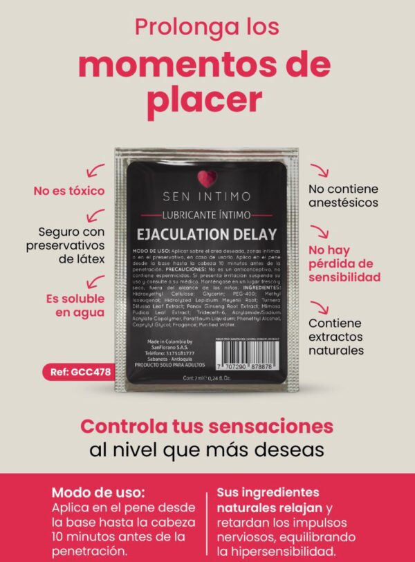 Modo de uso: Aplica en el pene desde la base hasta la cabeza 10 minutos antes de la penetración.